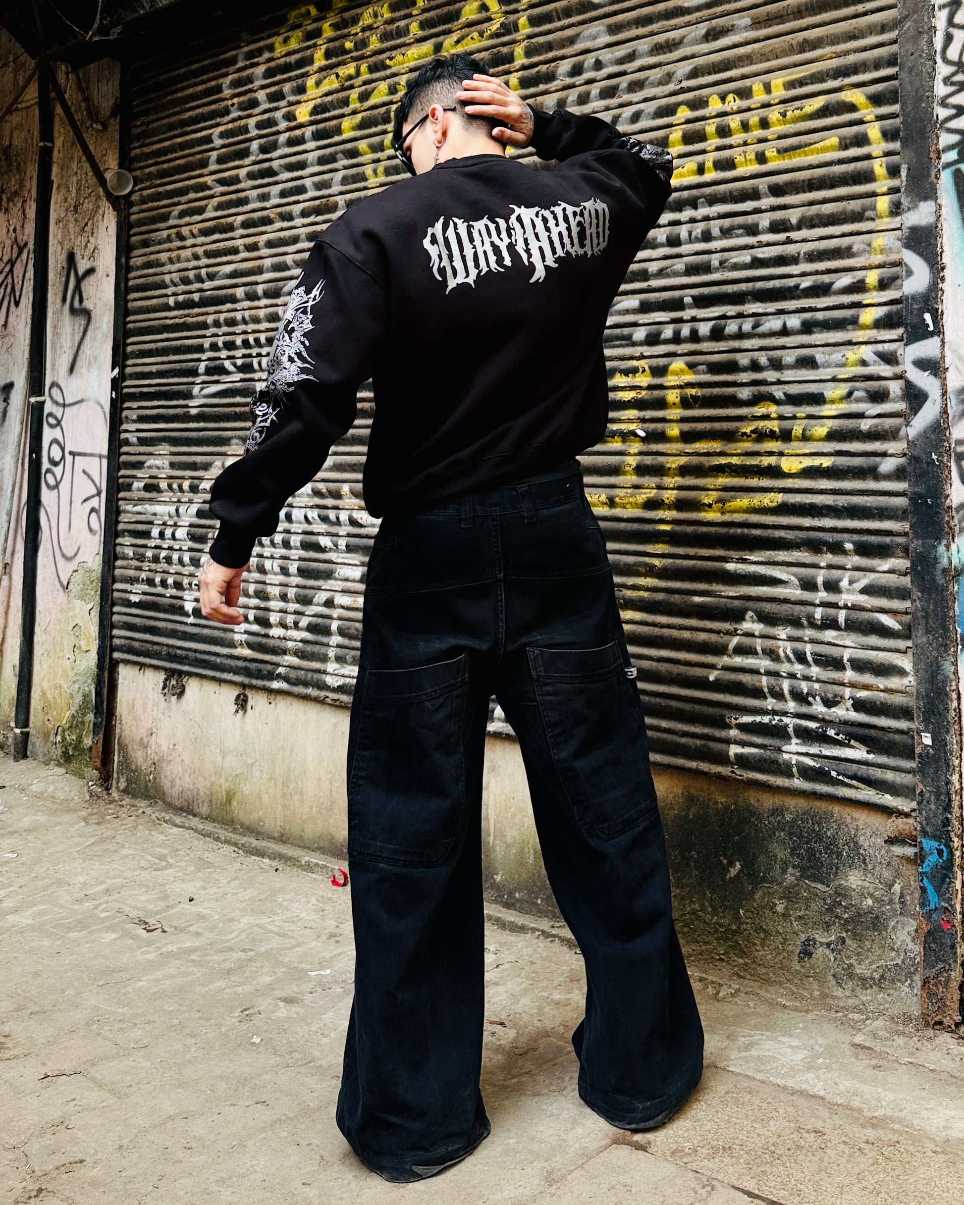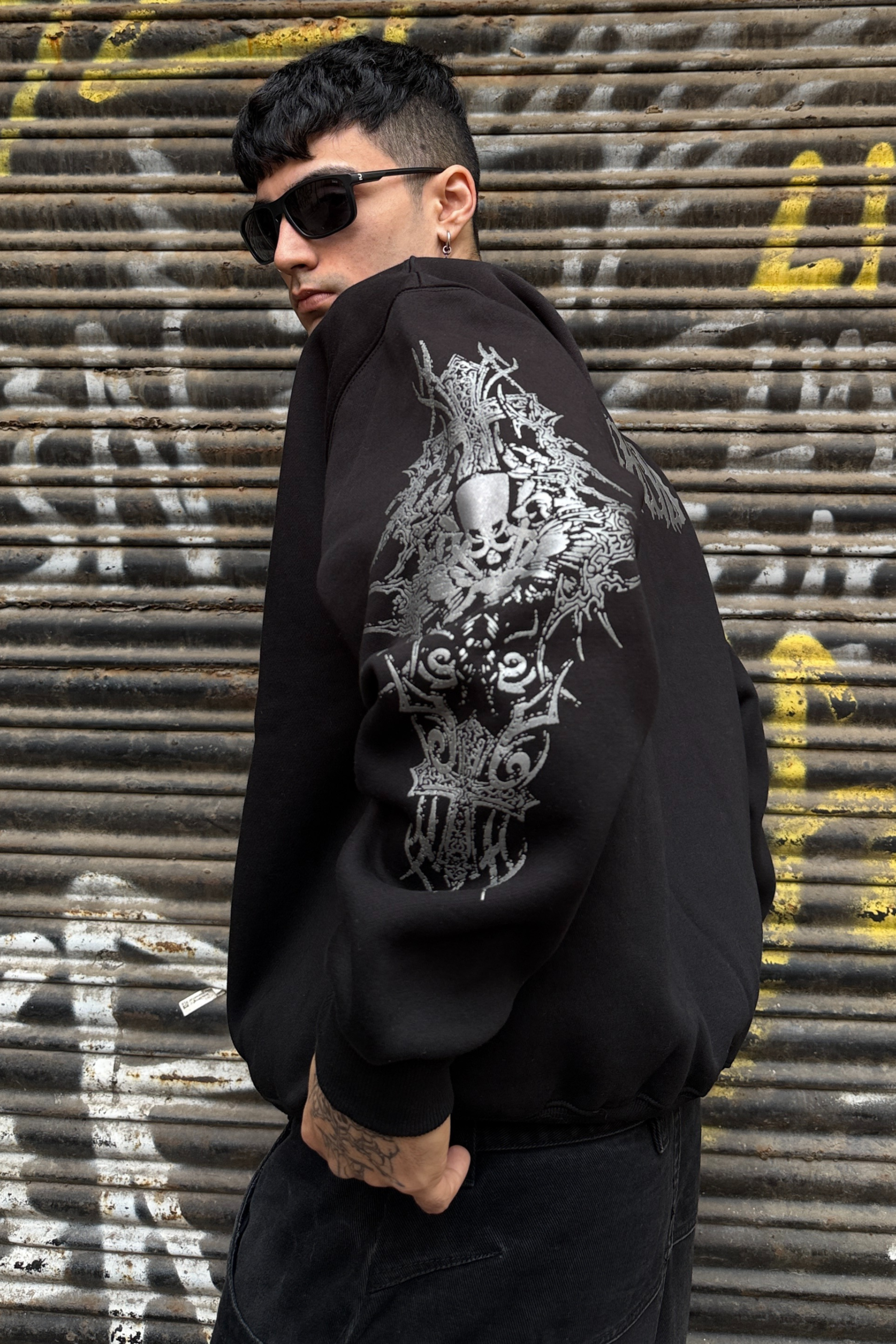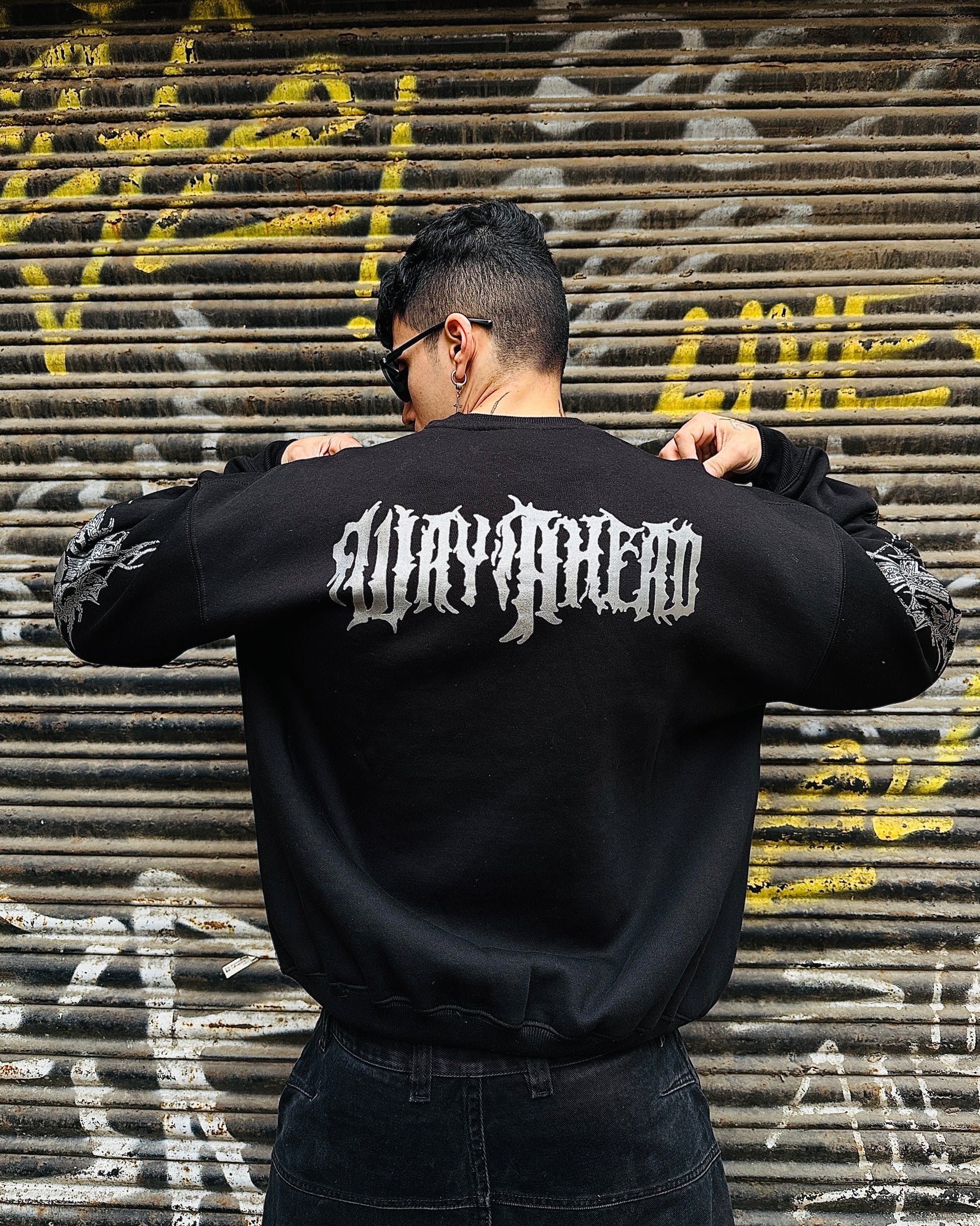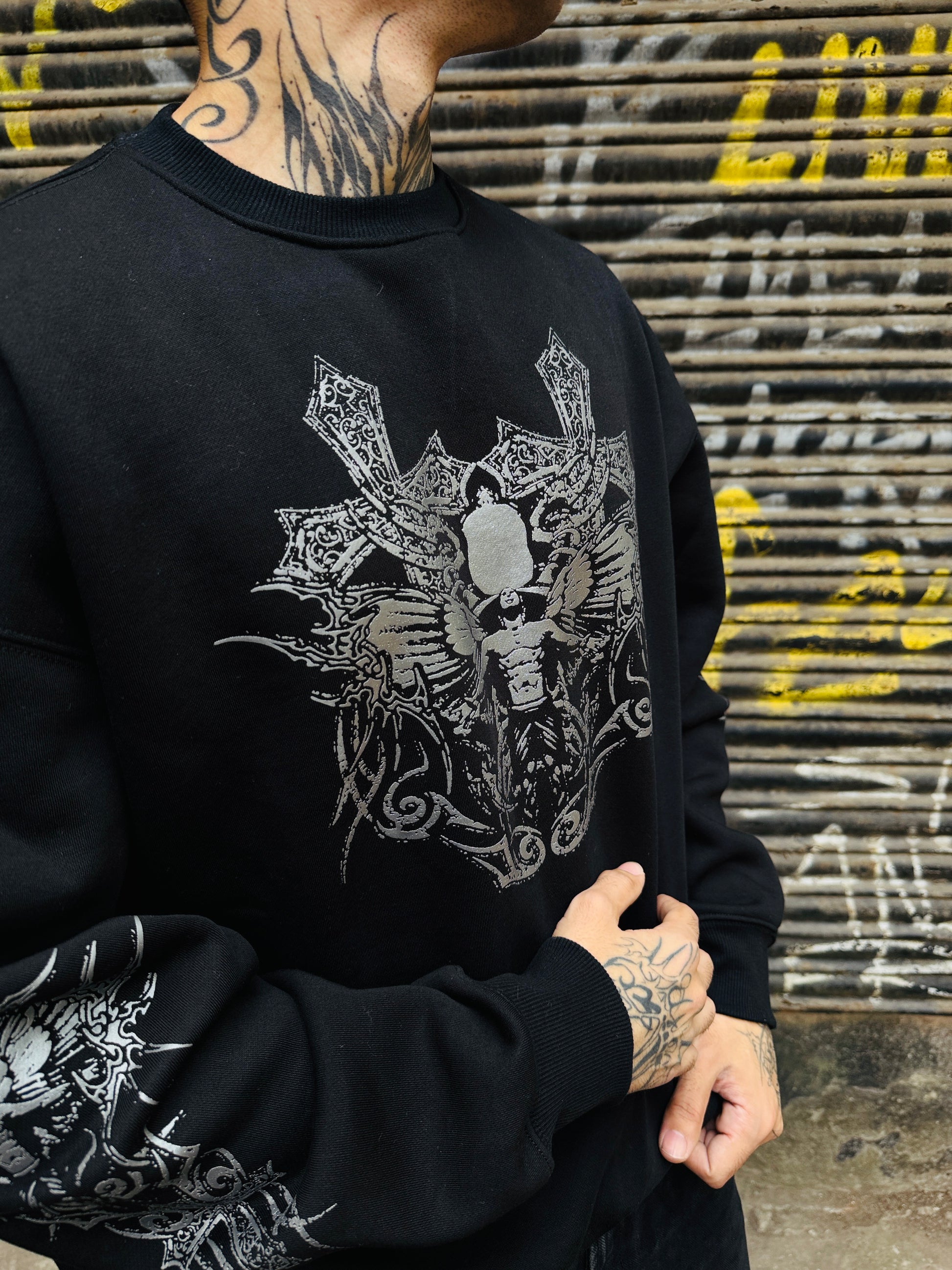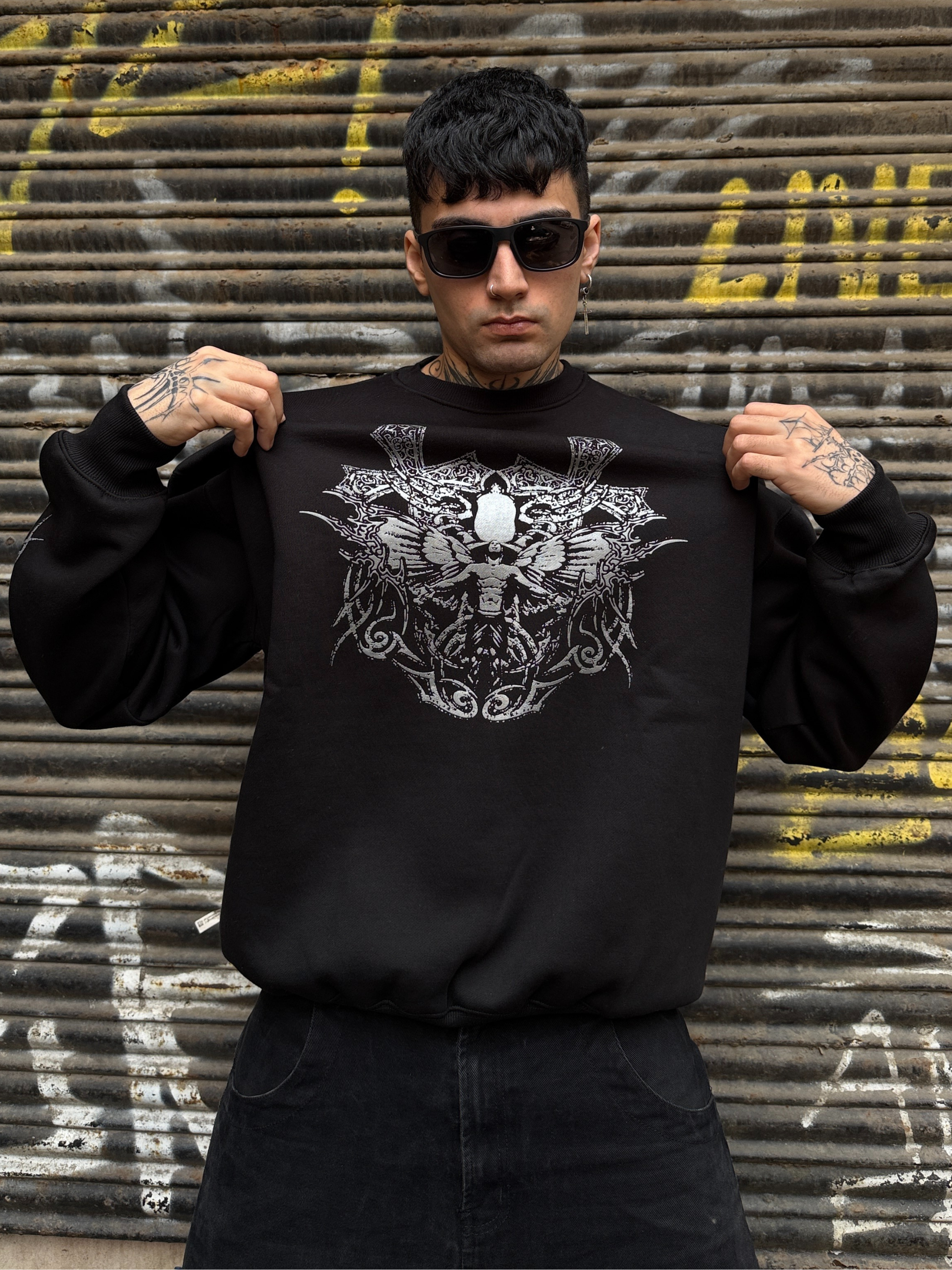 Step into the extraordinary with our 'Above All' Sweatshirt– where an ethereal devil floats amidst the cosmic echoes, flanked by two bold crosses.